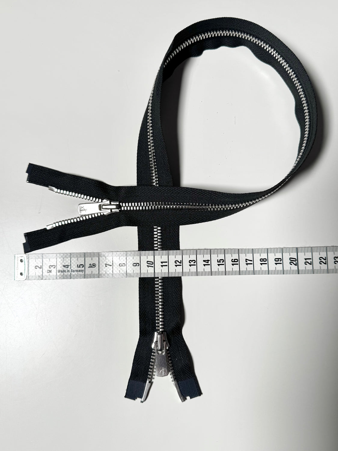 Unique opportunity to purchase a limited edition of this premium two-way, open-end YKK metal zipper, made in Italy. This 5 mm, two-way, open-end zip (right insert when worn) features matching DA2E sliders in silver finish for effortless function and a refined, high-end detail. 5 mm wide Excella zipper in silver plated solid brass. Very smooth slider! Both sliders are in zinc alloy with silver finish. Black zip tape in 100% Polyester Two lengths are available: - 55 cm suitable for Only jacket size XS - M - 60 cm suitable for Only jacket size L - 2XL Each 5 mm silver metal tooth element is individually polished before being mounted on the black tape, creating a smooth, luxurious look and feel.
